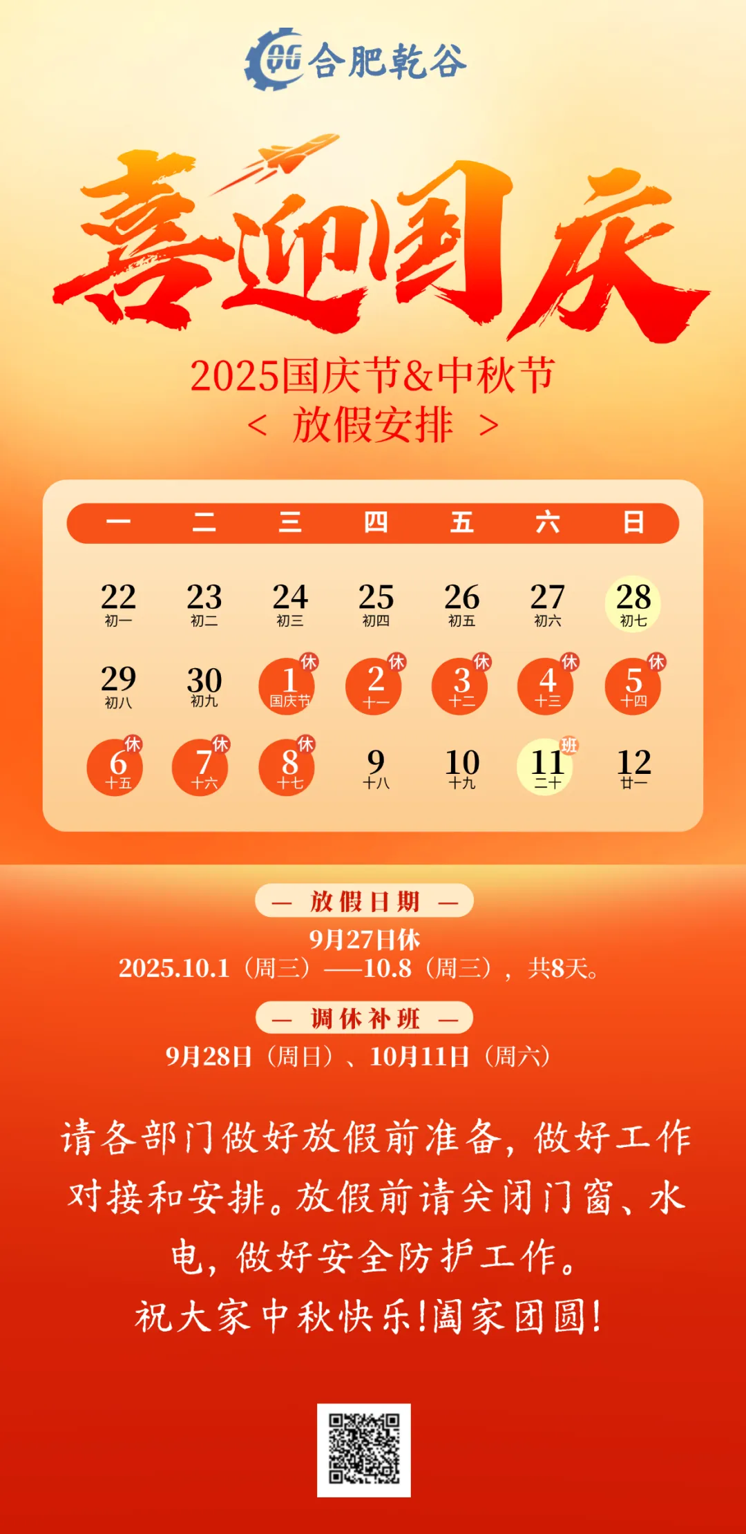 国庆假期即将来临,乾谷将于2025年10月1日开始放假,10月9日正式上班。假期期间只接单不发货,祝各位节日快乐!